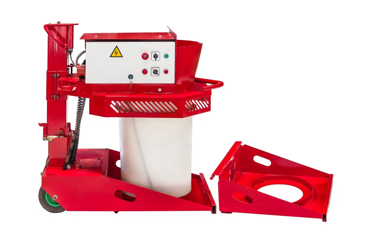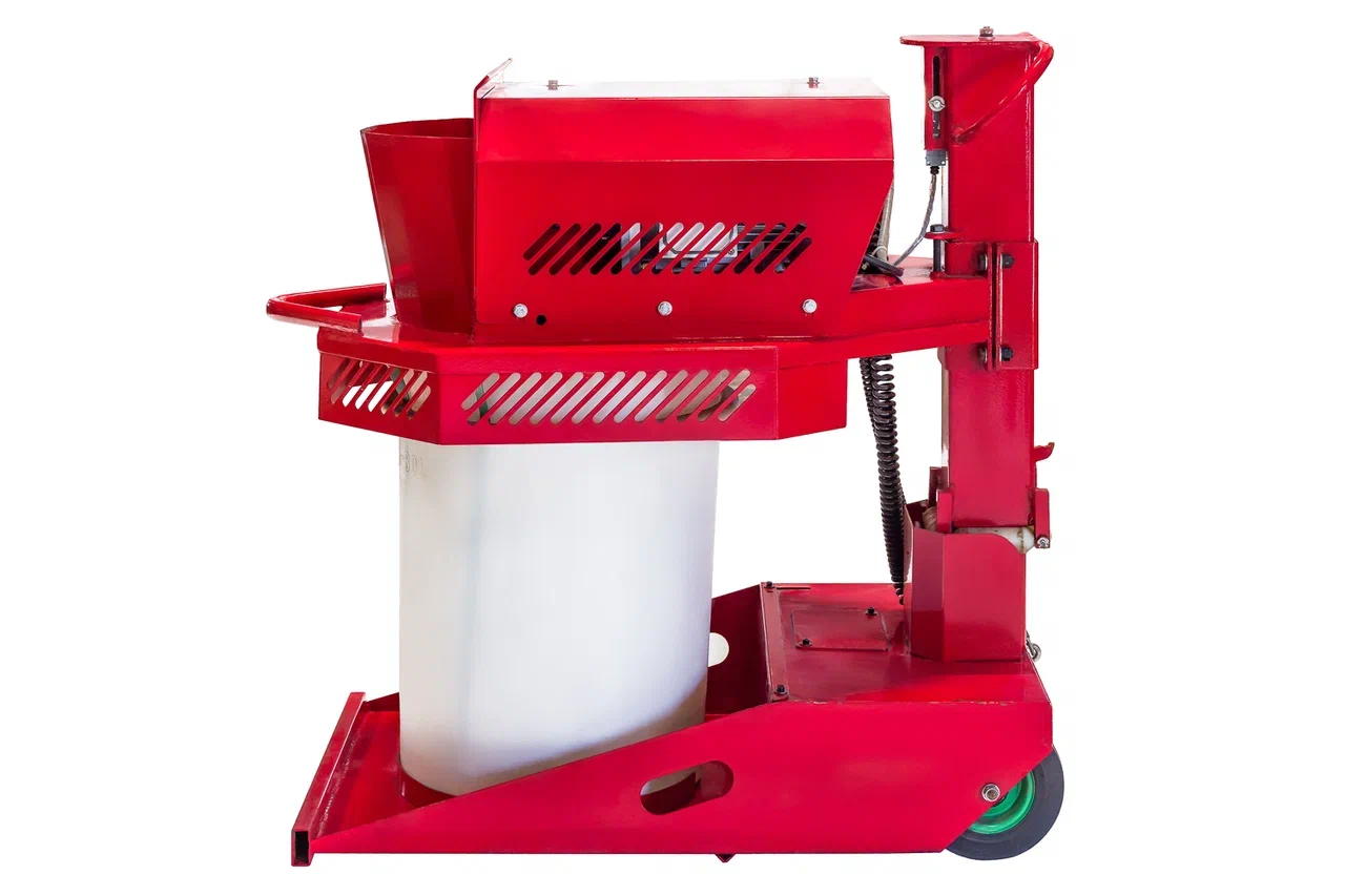 Миксер с электроприводом для производства резиновых покрытий. Перемешивает резиновую крошку, полиуретановое связующее и пигменты в однородную массу за 5 минут. Максимально допустимая разовая загрузка — 90 кг.